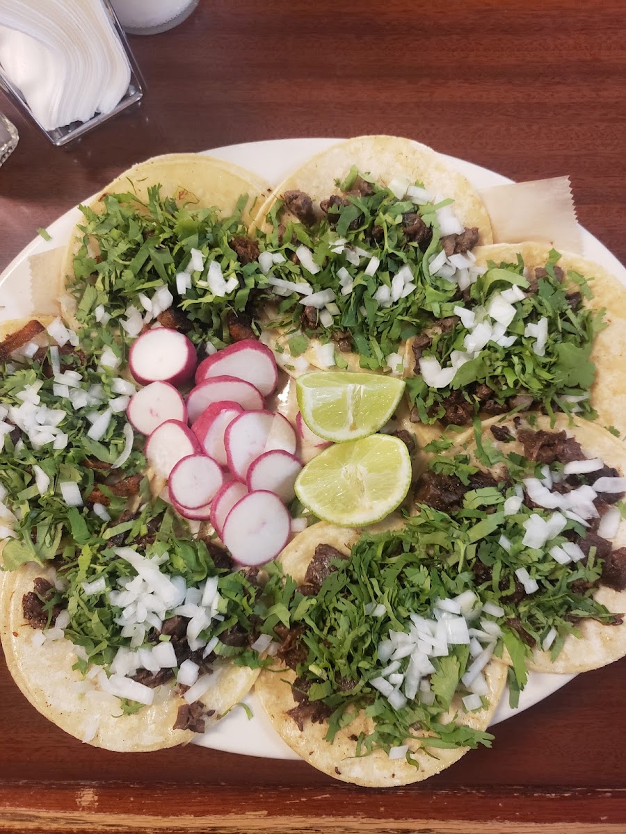 Priced individually. Grilled steak and chorizo tacos with fresh onions and cilantro served with salsa, lime, and radishes.